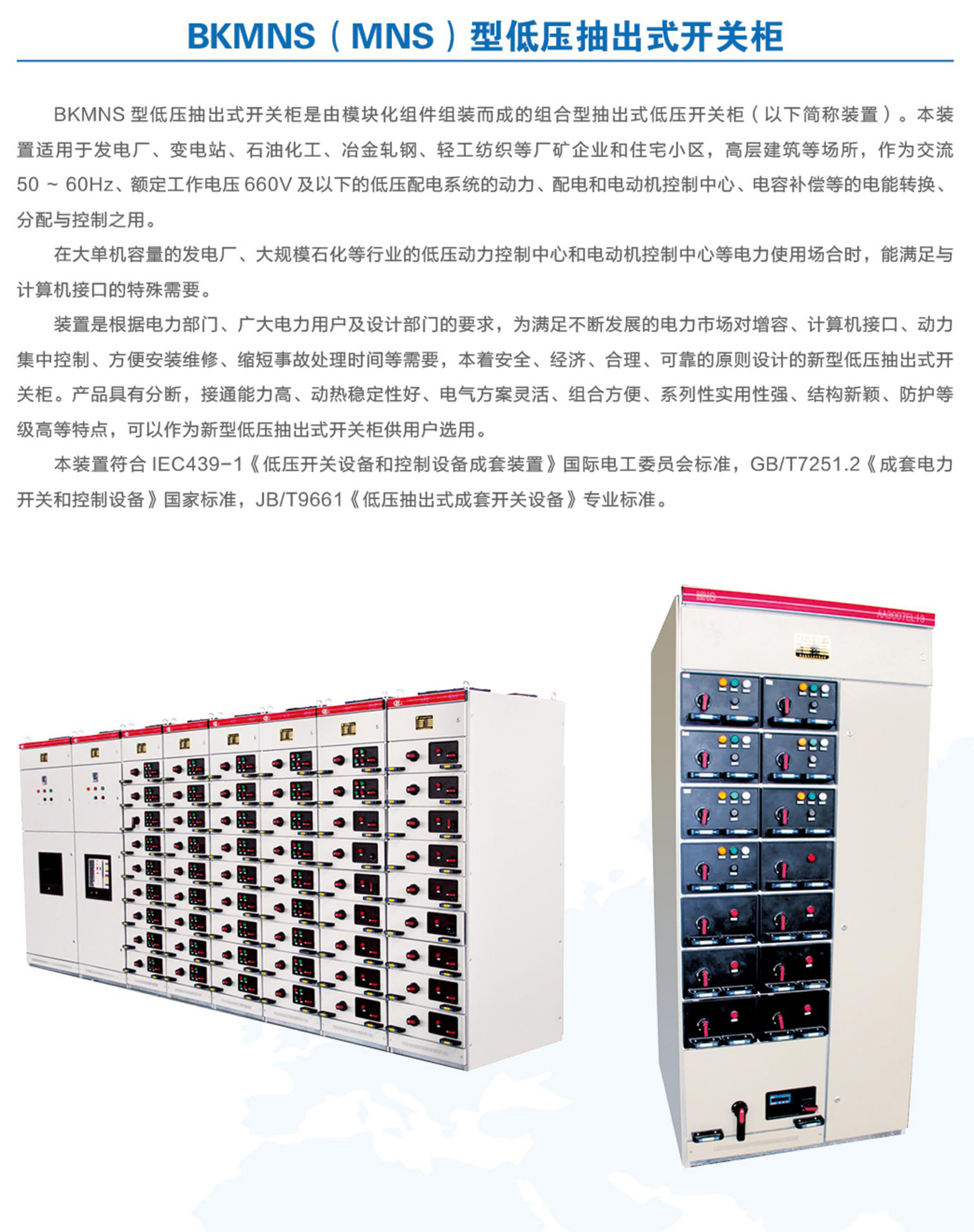 BKMNS 型低壓抽出式開關(guān)柜是由模塊化組件組裝而成的組合型抽出式低壓開關(guān)柜(以下簡(jiǎn)稱裝置)。本裝置適用于發(fā)電廠、變電站、石油化工、冶金軋鋼、輕工紡織等廠礦企業(yè)和住宅小區(qū),高層建筑等場(chǎng)所,作為交流50~60Hz、額定工作電壓660V及以下的低壓配電系統(tǒng)的動(dòng)力、配電和電動(dòng)機(jī)控制中心、電容補(bǔ)償?shù)鹊碾娔苻D(zhuǎn)換、分配與控制之用。在大單機(jī)容量的發(fā)電廠、大規(guī)模石化等行業(yè)的低壓動(dòng)力控制中心和電動(dòng)機(jī)控制中心等電力使用場(chǎng)合時(shí),能滿足與計(jì)算機(jī)接口的特殊需要。裝置是根據(jù)電力部門、廣大電力用戶及設(shè)計(jì)部門的要求,為滿足不斷發(fā)展的電力市場(chǎng)對(duì)增容、計(jì)算機(jī)接口、動(dòng)力集中控制、方便安裝維修、縮短事故處理時(shí)間等需要,本著安全、經(jīng)濟(jì)、合理、可靠的原則設(shè)計(jì)的新型低壓抽出式開關(guān)柜。產(chǎn)品具有分?jǐn)?,接通能力高、?dòng)熱穩(wěn)定性好、電氣方案靈活、組合方便、系列性實(shí)用性強(qiáng)、結(jié)構(gòu)新穎、防護(hù)等級(jí)高等特點(diǎn),可以作為新型低壓抽出式開關(guān)柜供用戶選用。