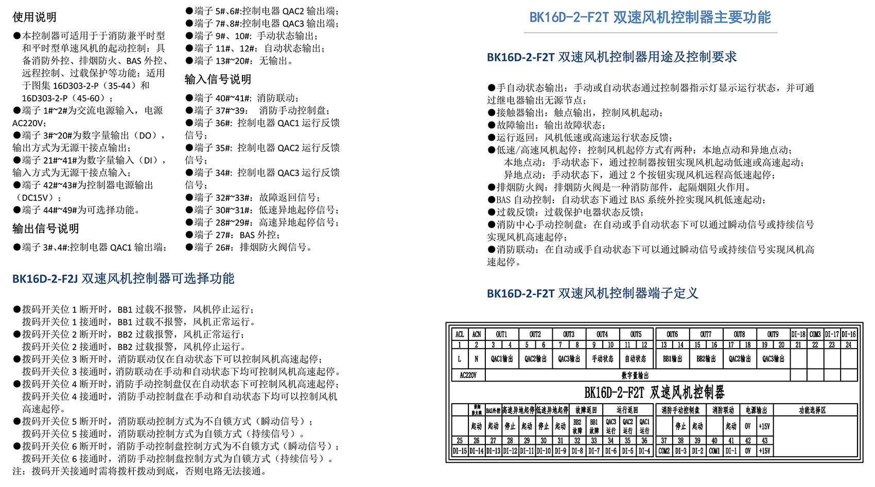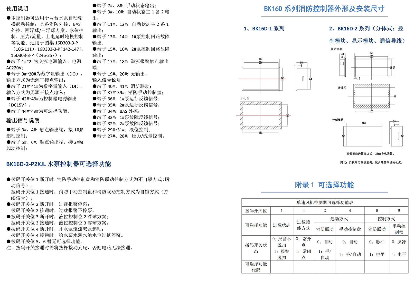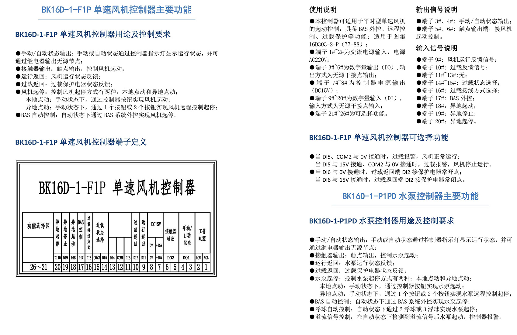 BK16D系列電動設(shè)備控制器是一款針對行業(yè)風(fēng)機(jī)水泵控制箱設(shè)計的系列產(chǎn)品,產(chǎn)品滿足國家建筑標(biāo)準(zhǔn)設(shè)計圖集《16D303-2 常用風(fēng)機(jī)控制電路圖》及《16D303-3 常用水泵控制電路圖》。本產(chǎn)品采用智能化手段,用邏輯計算代替了傳統(tǒng)的按鈕、指示燈、轉(zhuǎn)換開關(guān)、中間繼電器、時間繼電器等器件,接線方便,簡單快捷。相較于傳統(tǒng)的接線方式,本產(chǎn)品可節(jié)約硬件投入、減少二次布線、節(jié)約工時,并具備故障率低,檢修方便。