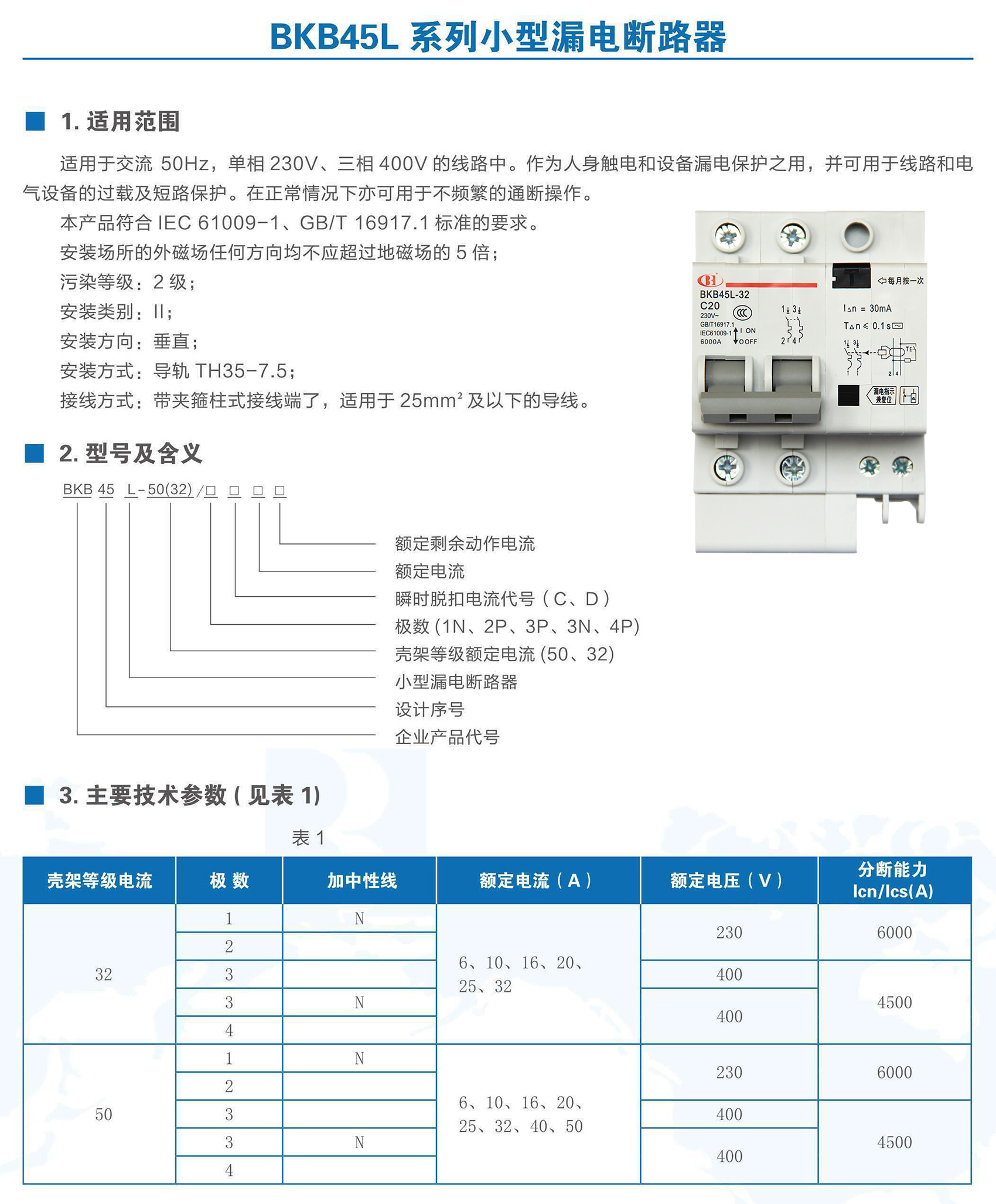 BKB45L-32系列帶剩余電流保護(hù)小型斷路器適用于交流50Hz、額定電壓至400V,額定電流6~32A 的線路中。作為人身觸電和設(shè)備漏電保護(hù)之用,并可用于線路和電氣設(shè)備的過載以及短路保護(hù)。在正常情況下亦可用于不頻繁的通斷操作。本產(chǎn)品符合GB/T 16917.1、IEC 61009-1標(biāo)準(zhǔn)。