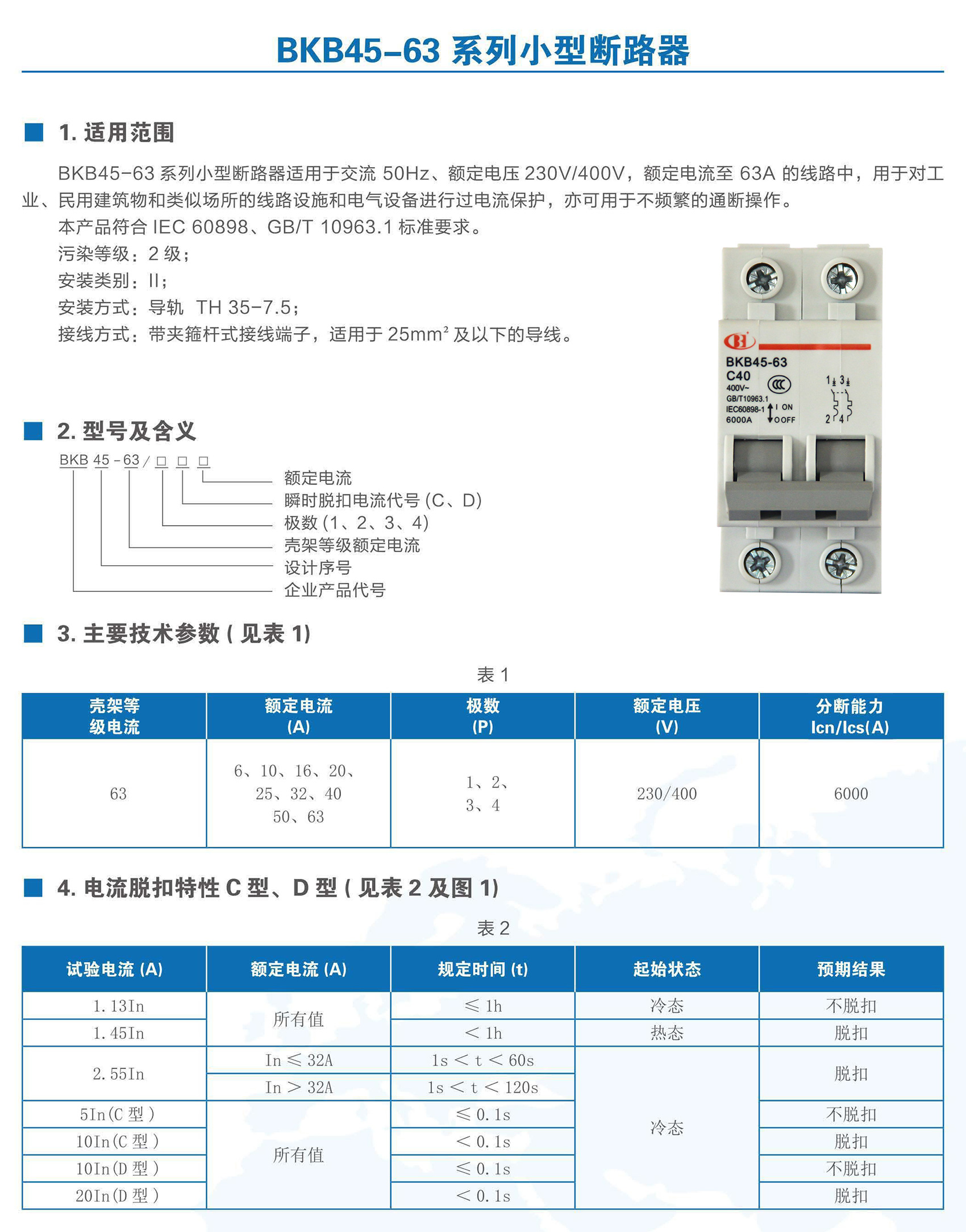 BKB45-63系列小型斷路器適用于交流50Hz,額定電壓至400V,額定電流6~63A,額定絕緣電壓400V的系統(tǒng)線路中。用來對建筑電廠、變電站、電信、交通、冶金、工礦業(yè)等及類似場所的系統(tǒng)線路、電氣設(shè)備進(jìn)行過電流保護(hù),也可以用于不頻繁的通斷操作。適用于非專業(yè)人員使用且不需要進(jìn)行維護(hù)。本產(chǎn)品符合GB/T 10963.1、IEC 60898-1標(biāo)準(zhǔn)。