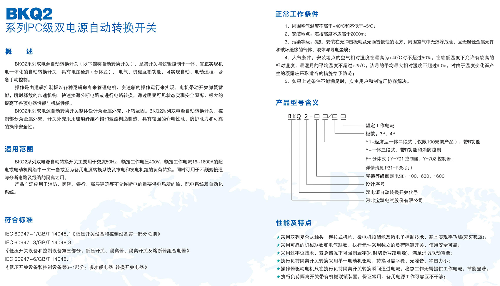BKQ2系列雙電源自動(dòng)轉(zhuǎn)換開(kāi)關(guān)電器主要用于交流50Hz,額定工作電壓400V及以下,額定工作電流16A至1600A的配電或電動(dòng)機(jī)網(wǎng)絡(luò)中一主一備或互為備用電源轉(zhuǎn)換系統(tǒng)及市電和發(fā)電機(jī)組的負(fù)荷轉(zhuǎn)換。同時(shí)可用于不頻繁接通與分?jǐn)嚯娐芳熬€路的隔離之用。產(chǎn)品廣泛應(yīng)用于消防、醫(yī)院、銀行、高層建筑等不允許斷電的重要供電場(chǎng)所的輸、配電系統(tǒng)及自動(dòng)化系統(tǒng)。本產(chǎn)品符合GB/T 14048.11《低壓開(kāi)關(guān)設(shè)備和控制設(shè)備 第 6-1 部分:多功能電器 轉(zhuǎn)換開(kāi)關(guān)電器》。